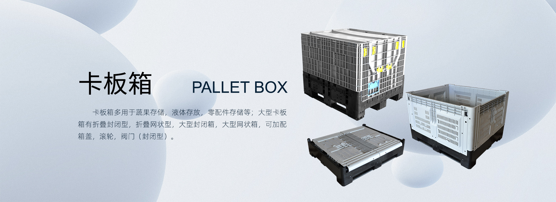 • 卡板箱多用于蔬果存儲,液體存放,零配件存儲等;大型卡板箱有折疊封閉型、折疊網狀型、大型封閉箱、大型網狀箱;可加配箱蓋,滾輪、閥門(封閉型)。